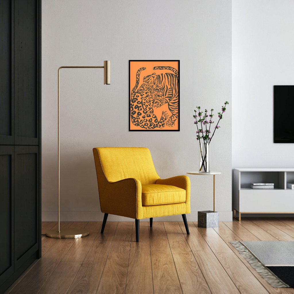 Telegraphic. You can have a unique piece of art with real artistic value in your home. Laura Limbourg's serigraph with a tiger motif reflects the artist's experience of visiting Southeast Asia. The colours, together with the primitivised execution, embody the spirit of Asian countries and refer to the strong visual tradition there. The work is part of a limited series of prints created during the months Laura Limbourg spent in the USA. Thus, the speed at which the USA lives has functioned here as a kind of counterpoint to Laura's Asian experience.